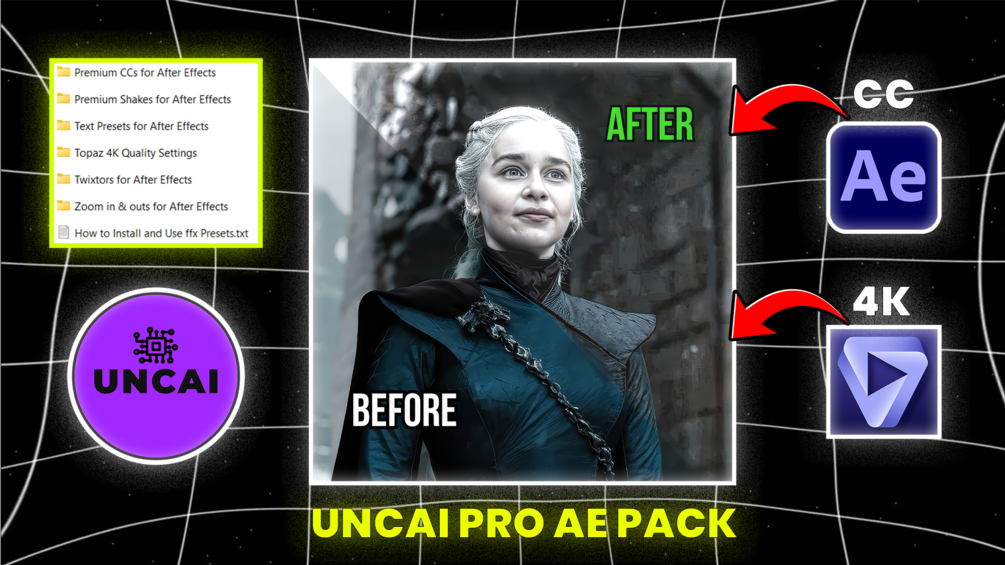 UNCAI Pro AE Pack – 4K Upscale, 3D Text, Smooth Zooms, Twixtors & Premium CCs